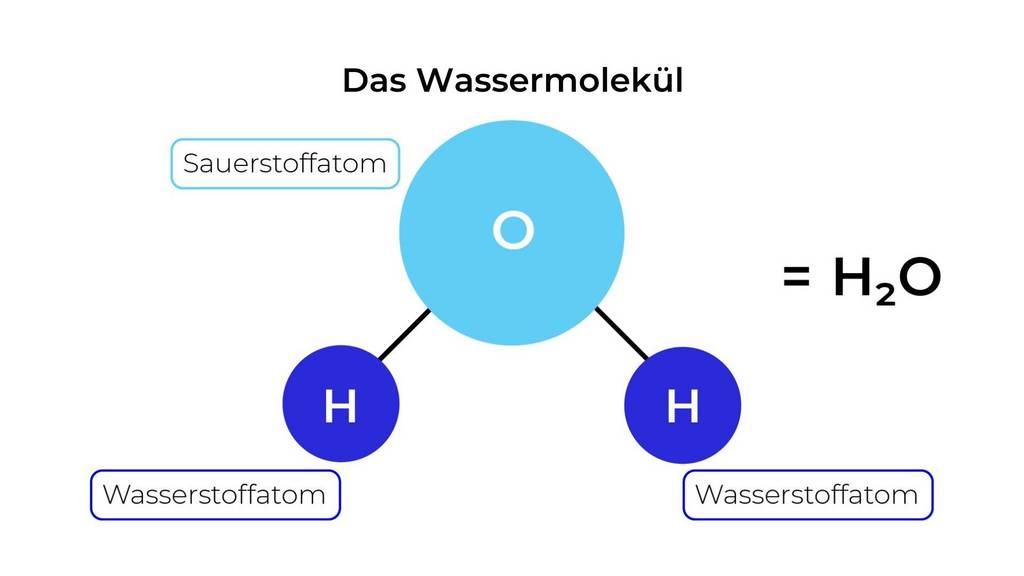 In einem WassermolekĂŒl sind zwei Wasserstoffatome an ein Sauerstoffatom gebunden.
